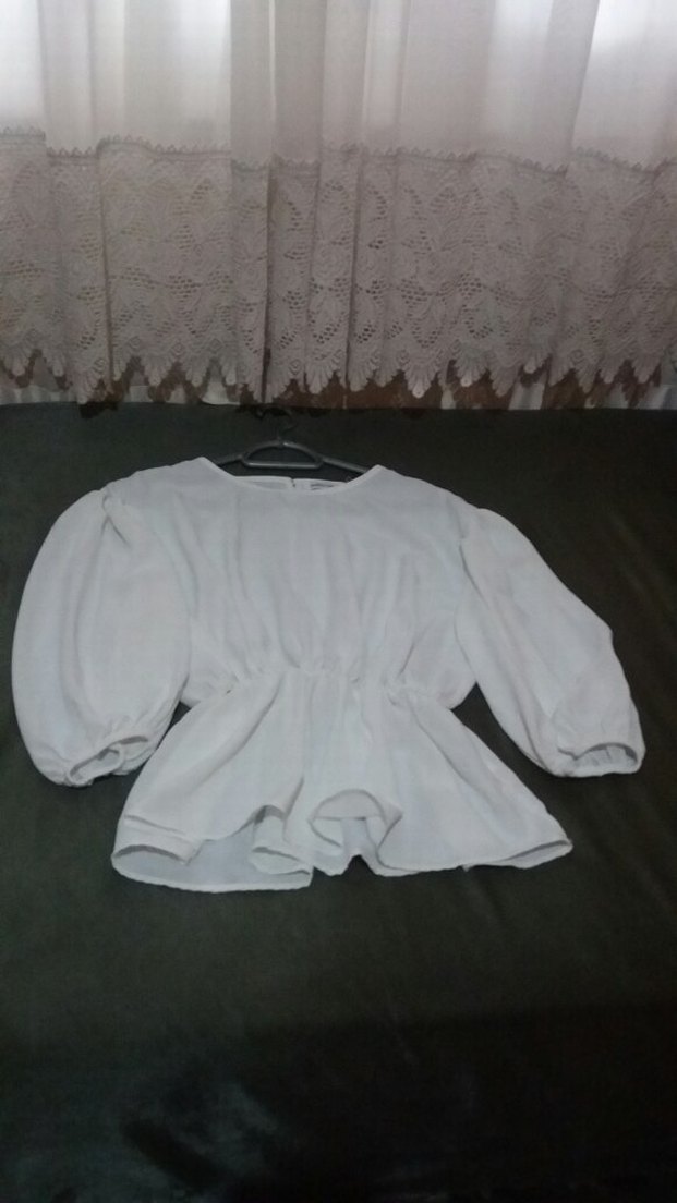 Beyaz keten kumaştan, uzun kollu, düğmeli ve bol kesim mini bluz. Günlük kullanım için uygundur.