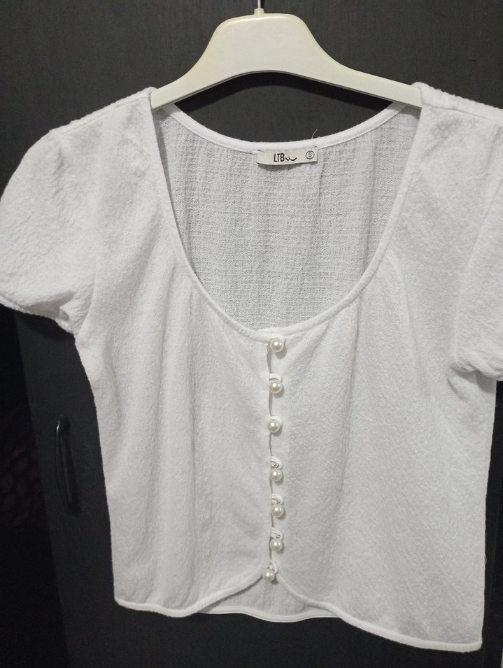 Beyaz keten kumaştan, düğmeli, kısa kollu ve yuvarlak yakalı, bohem tarzda, salaş kesim mini bluz. Günlük kullanıma uygundur.