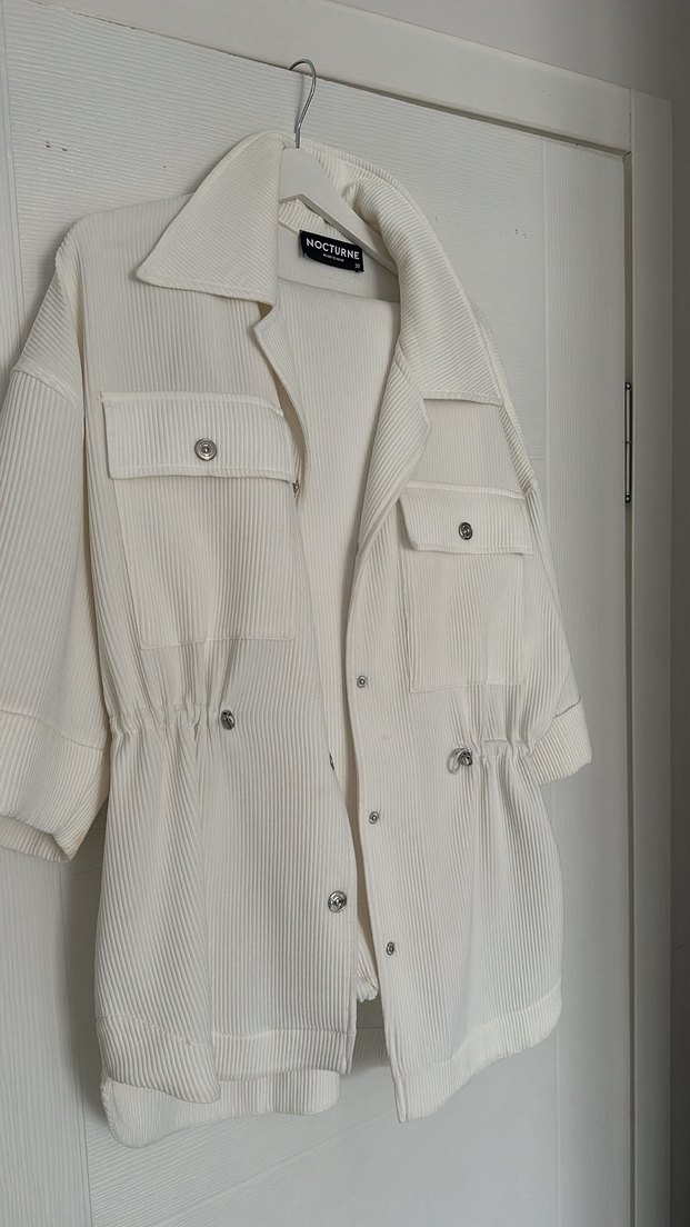 Düğmeli önü, kısa kollu, keten kumaştan beyaz mini gömlek. Rahat ve bol kesimli, günlük sokak stili için uygundur.