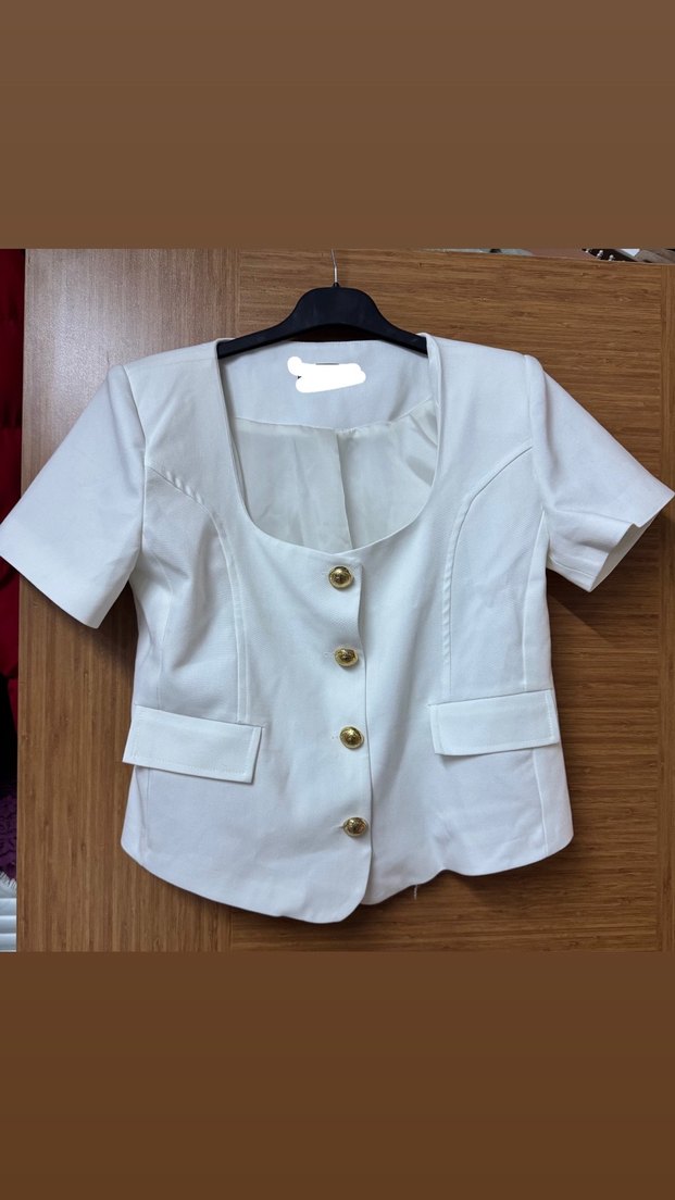Düğmeli ön kısmı, kısa kollu ve yakası notlu kısa kesim beyaz keten kadın gömleği. Ofis ve günlük şıklık için ideal.