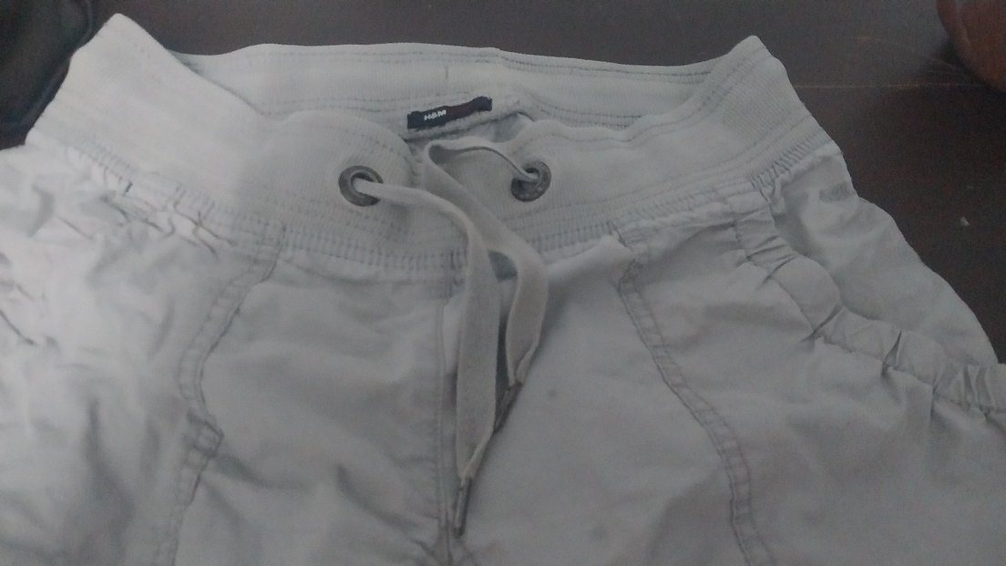 Düğmeli ve bağcıklı beyaz keten mini pantolon, rahat ve normcore tarzıyla günlük kullanıma uygundur.