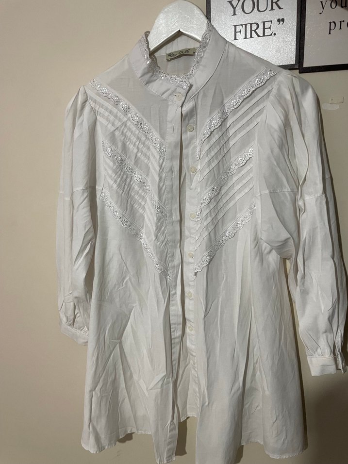 Düğmeli, yakalı beyaz keten kadın gömlek. Nakışlı, uzun kollu ve bol kesim. Vintage ve bohem tarzı, midi boy, günlük kullanım için uygundur.