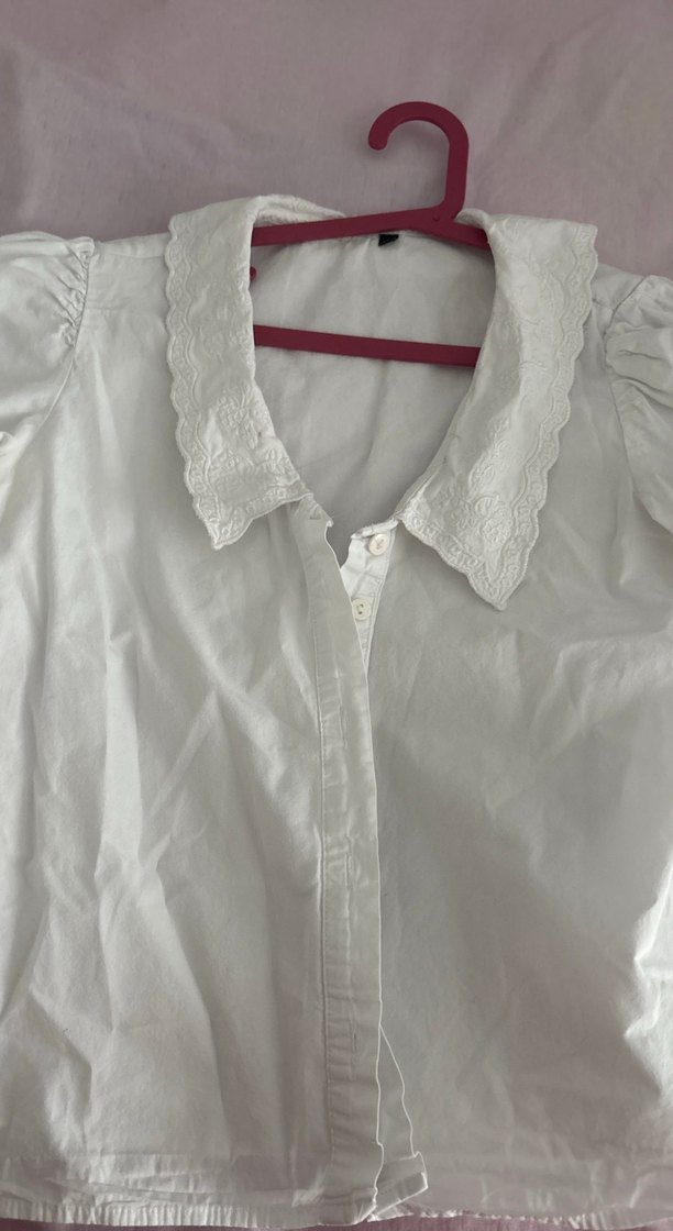 Düğmeli, fırfırlı yakalı beyaz keten kadın gömleği, kısa kollu ve bol kesimdir. Vintage bohem tarzıyla günlük kullanıma uygundur.
