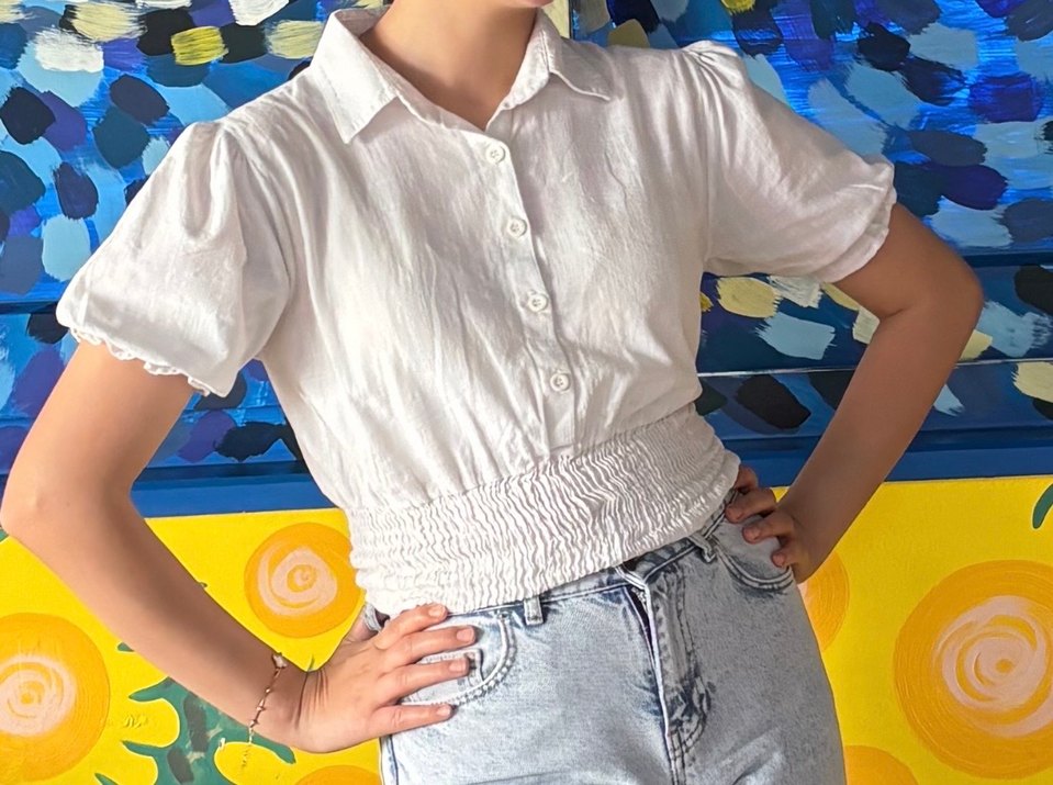 Düğmeli, yakalı ve kısa kollu beyaz keten bluz. Salaş kesimi ve büzgülü beliyle günlük sokak stiline uygun.