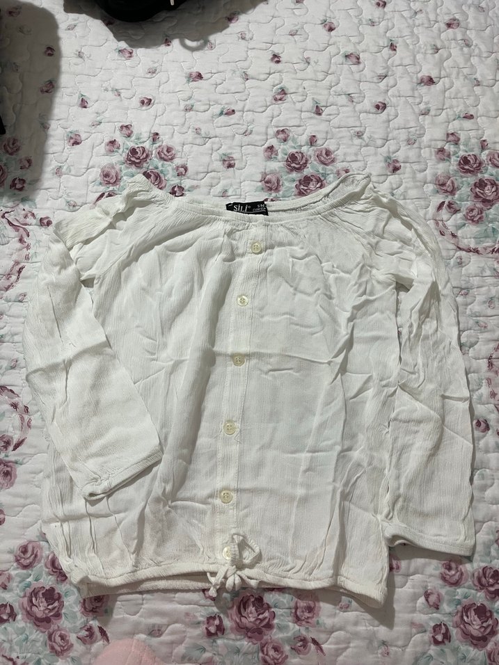 Düğmeli, beyaz keten kumaştan, uzun kollu ve kısa kesim bohem tarzda bluz. Tek renk, salaş ve vintage görünümlü.