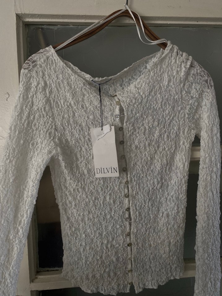 Düğmeli, uzun kollu, beyaz keten bluz. Tekstil dokulu, tek renk, tekne yaka ve dar kesim özelliklerine sahiptir. Marka: DILVIN.