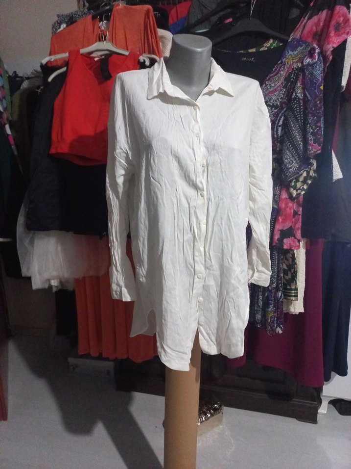 Beyaz keten, uzun kollu, düğmeli ve yakalı gömlek. Salaş kesim ve midi boy ile günlük rahat kullanıma uygundur. iki kol arası 60cm boy 80cm