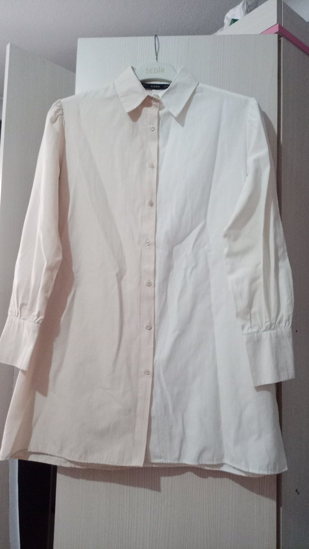 Beyaz keten kumaştan, uzun kollu ve düğmeli önü olan, normal kesim ve midi boy gömlek.Sayılı giyildi, tertemiz