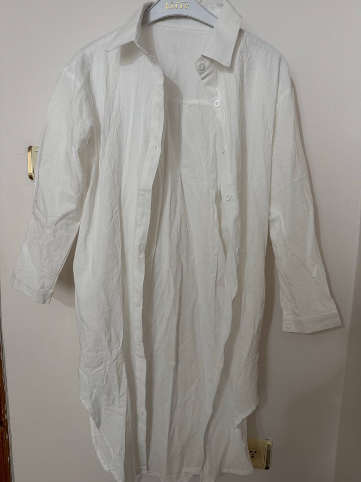 Beyaz keten kumaştan yapılmış, düğmeli, uzun kollu ve yakalı kadın gömleği. Gevşek kesimi ve uzun boyu günlük kullanım ve sokak stiline uygundur.