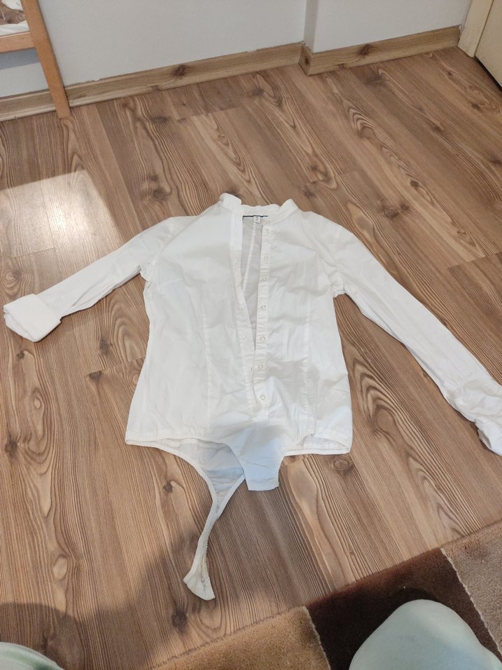 Düğmeli beyaz keten gömlek, uzun kollu ve yakalı, vücuda oturan kesimiyle günlük kullanıma uygun. hakim yaka.kadın hakim yaka gömlek sbeden son fotoğrafta var bir lekesi var