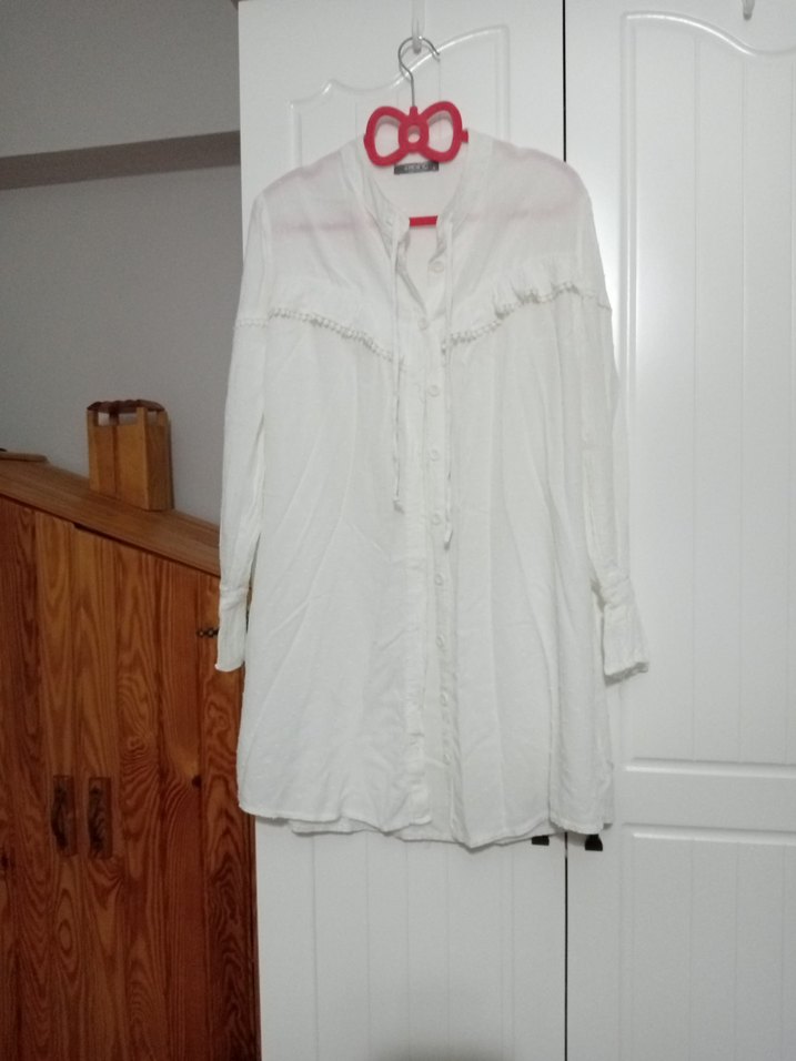 Beyaz keten kumaştan, düğmeli ve uzun kollu, yakalı, midi boyda, bol kesim kadın gömleği. Bohem tarzına uygundur.