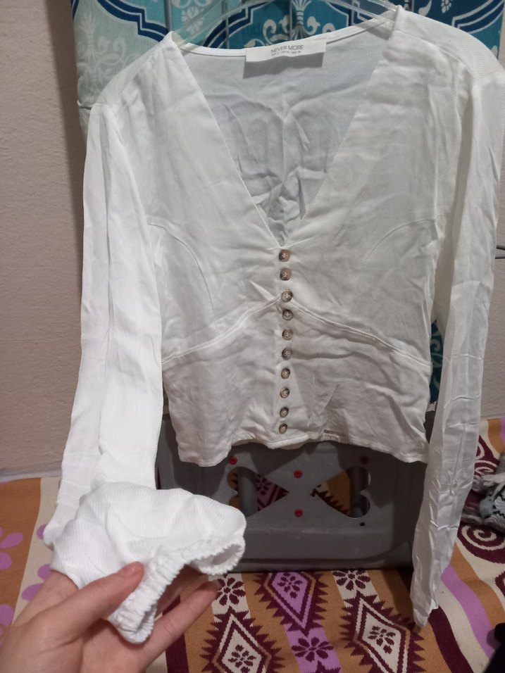 Beyaz keten kumaştan, V yakalı ve düğmeli uzun kollu, bol kesim bohem tarzında bluz. Günlük kullanım için uygundur.