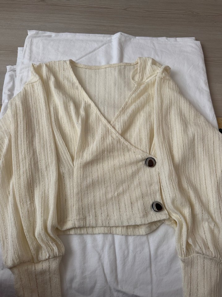 Beyaz keten kumaştan, V yakalı ve uzun kollu, düğmeli, rahat kesim bohem tarzda günlük kullanıma uygun bluz.