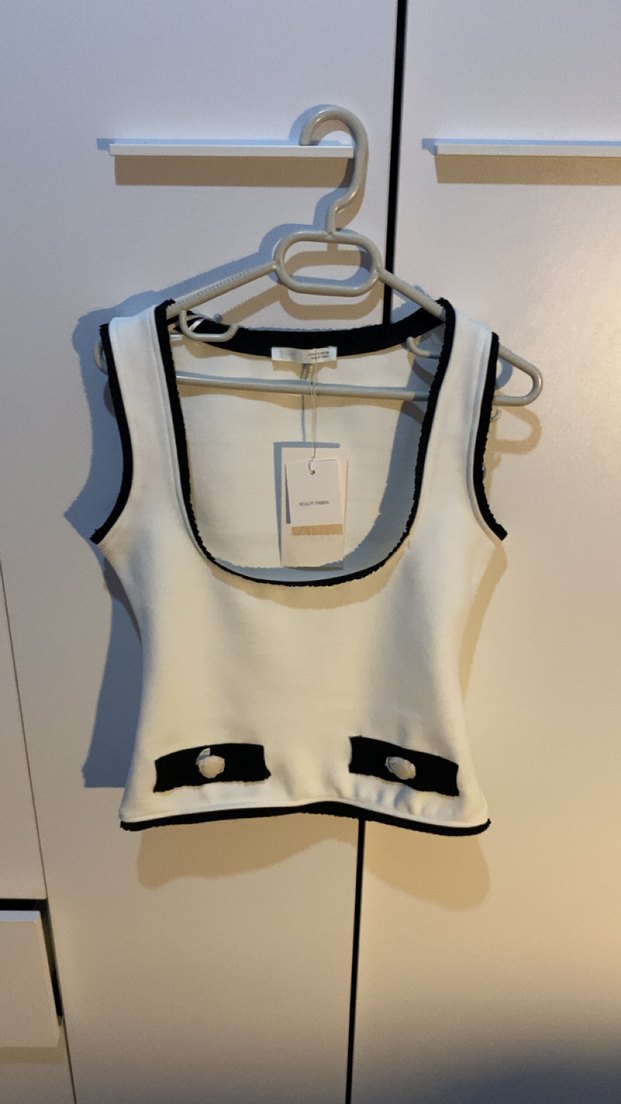 Düğmeli ve siyah detaylı, sentetik kumaştan yapılmış beyaz, kısa kesim, fitted kadın atlet. Paris tarzı sokak modasına uygun.