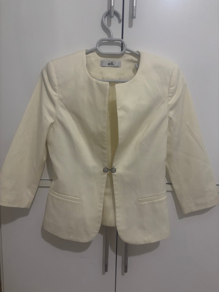 Beyaz kısa uzun kollu kadın blazer ceket, düğmeli ve modern klasik tarzda. Sentetik kumaştan, ofis için uygun, düz ve regular fit.