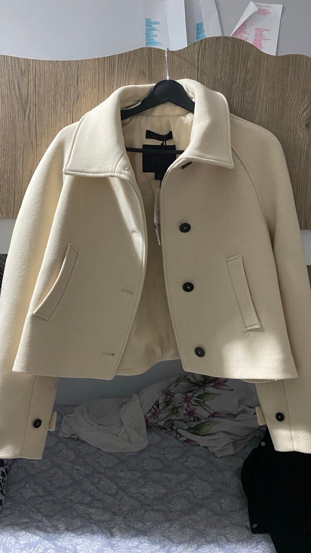 Düğmeli, beyaz kısa kaban, yumuşak ve sıcak kumaştan üretilmiştir. Uzun kollu, regular fit ve Paris tarzı günlük kullanıma uygundur. Zaradan alındı sorunu yok tamamen yün tüylenmez bu yüzden
