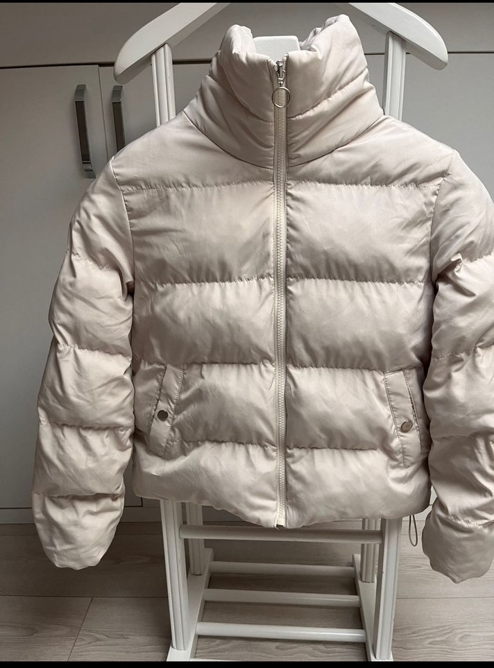 Kısa kesim, uzun kollu, sentetik kumaştan yapılmış, dar kesim kadın kışlık mont.