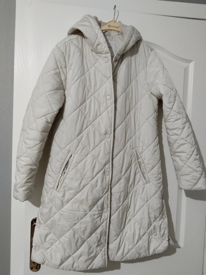 Düğmeli önü, uzun kollu ve kapüşonlu beyaz kısa mont. Rahat kalıp ve kapitone deseniyle günlük kullanıma uygundur.