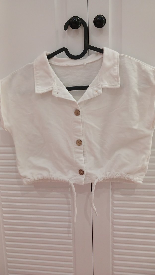 Pamuk kumaştan yapılmış beyaz crop. düğmeli ve kısa kollu etiketini kesmişiz markasını hatırlayamadım. cok güzel