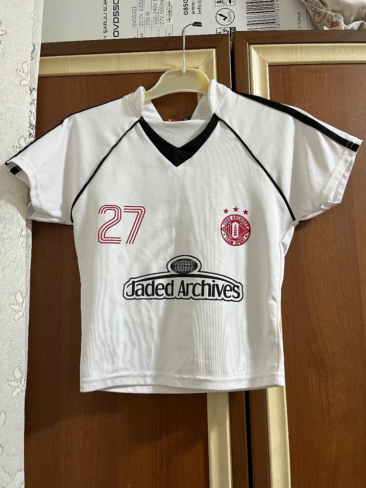 Düğmeli yakalı, kısa kollu ve beyaz renkte, 27 numara ve 'Jaded Archives' baskılı, sentetik kumaştan yapılmış, spor ve sokak stiline uygun erkek forması. ⚽