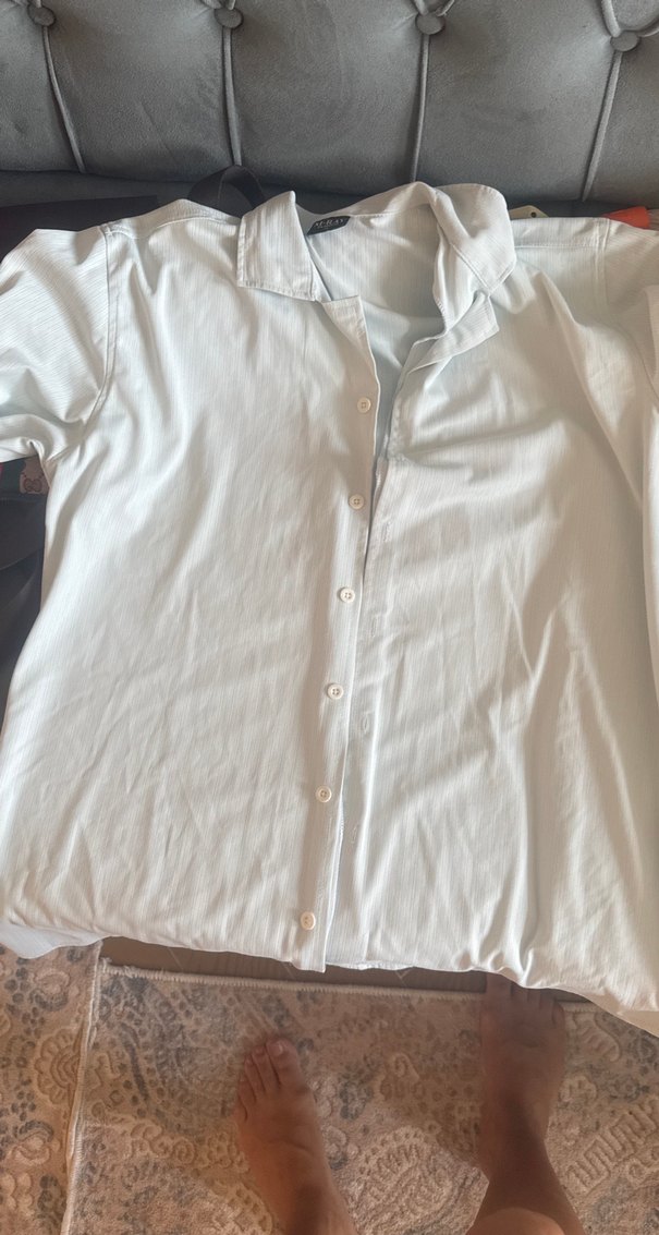 düğmeli ve yakalı, kısa kollu, bol kesim erkek gömleği. Beyaz ve desensiz, günlük sokak tarzına uygun.