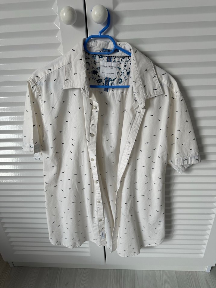 Düğmeli, kısa kollu, bol kesim ve yakalı erkek gömleği. Beyaz pamuklu kumaştan, gri detaylarla günlük rahat giyim için uygundur. Amerika’dan alınmıştır