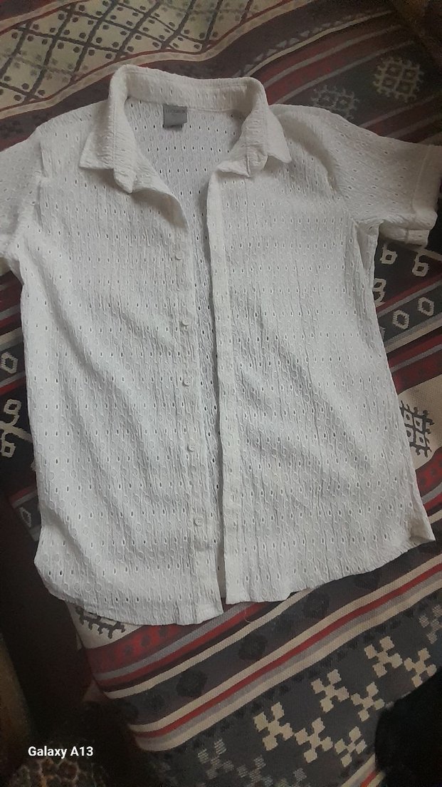 Beyaz pamuklu gömlek, kısa kollu ve düğmeli ön kısmıyla rahat bir kesime sahiptir. Hafif dokulu deseniyle günlük bohem ve retro stillere uygundur.