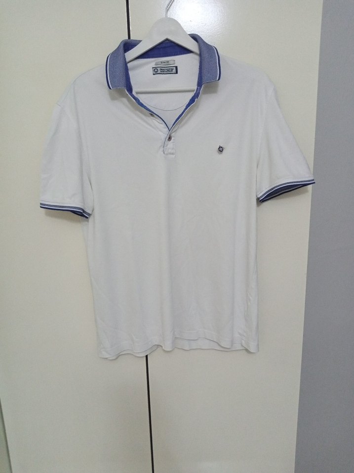 Pamuk kumaştan, düğmeli yakalı ve kısa kollu, beyaz renkli, gri detaylı, normal boyda, fitted kesim erkek polo tişört.