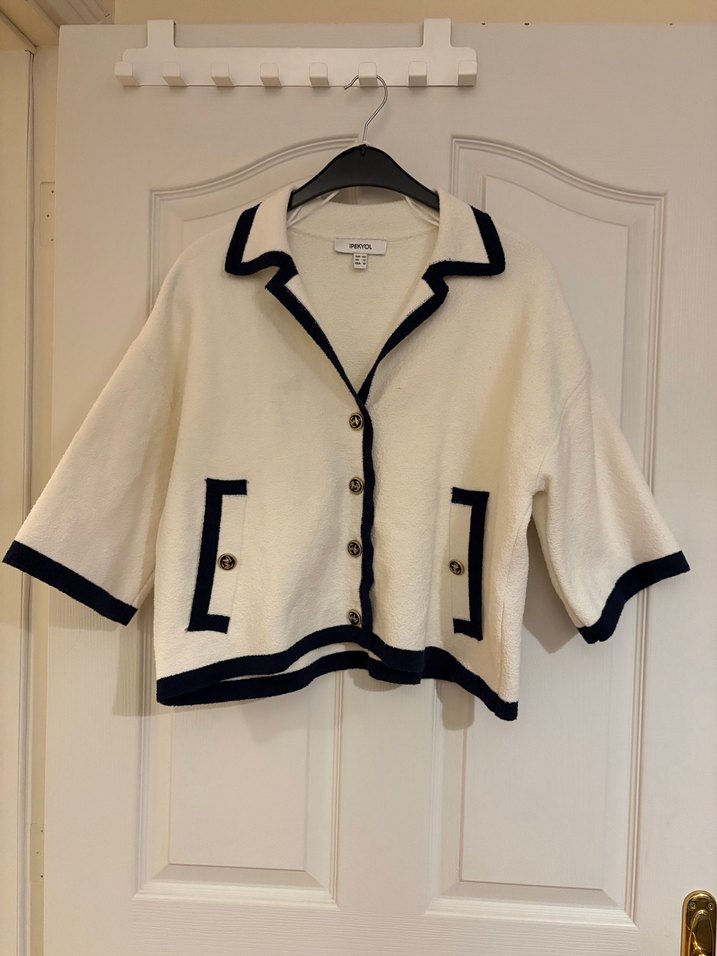 Pamuklu, düğmeli, kısa kollu beyaz hırka. Siyah şerit detaylı, geniş kesim ve normal uzunlukta, rahat sokak stili için uygun.