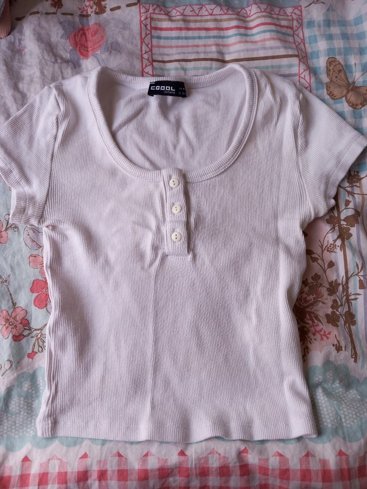 Pamuklu beyaz, kısa kollu, düğmeli ve bisiklet yakalı dar kesim kadın tişörtü. Günlük sokak stili için uygundur.