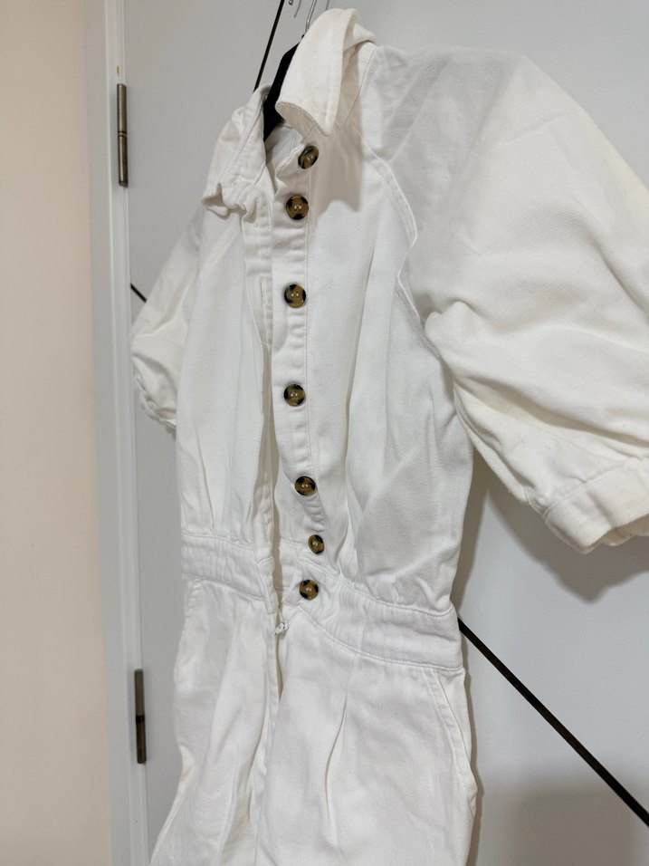 Beyaz keten kumaştan, düğmeli, yakalı ve kısa kollu, vücuda oturan midi uzunluğunda kadın tulumu.