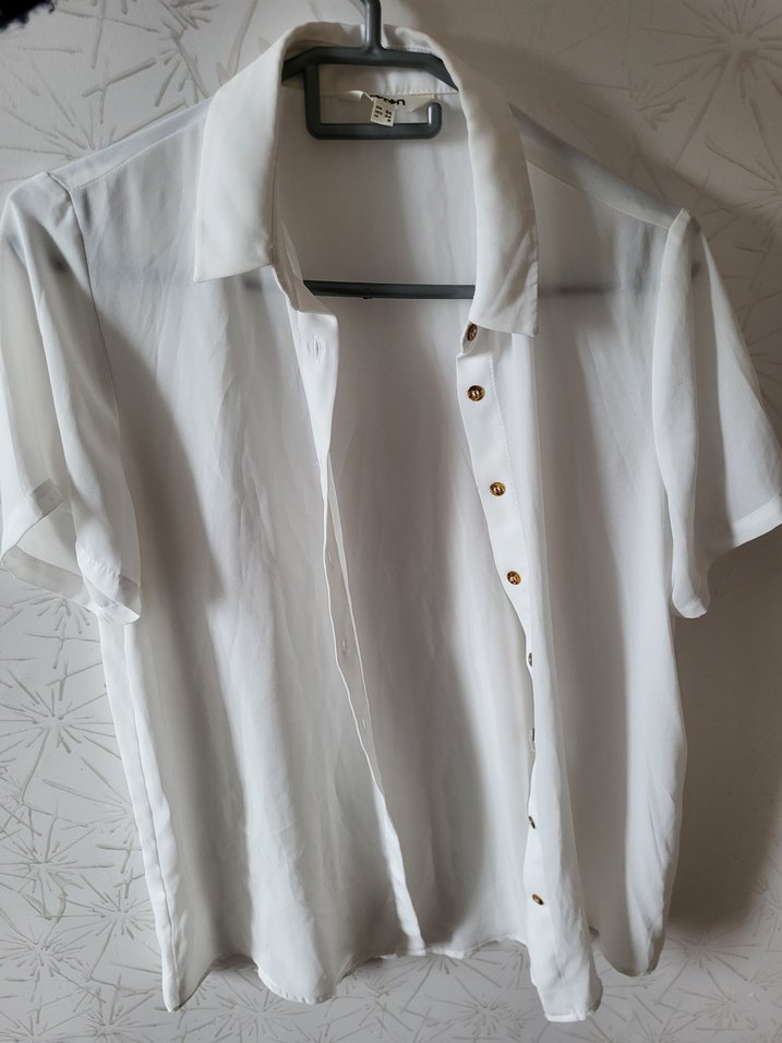 Düğmeli, kısa kollu beyaz keten gömlek, yakalı ve bol kesimdir. Parlak kumaşıyla minimalist ve trend sokak tarzını yansıtır. Günlük kullanıma uygundur.