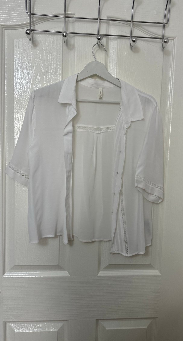 Düğmeli, kısa kollu, yakalı beyaz keten gömlek. Gevşek kesim ve minimal tasarımıyla bohem stil için uygundur.
