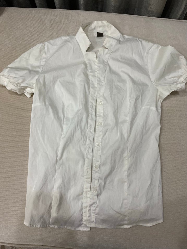 Düğmeli, kısa kollu, yakalı beyaz keten gömlek. Normal boyda, sade tasarımlı ve ofis ya da günlük kullanım için uygundur.