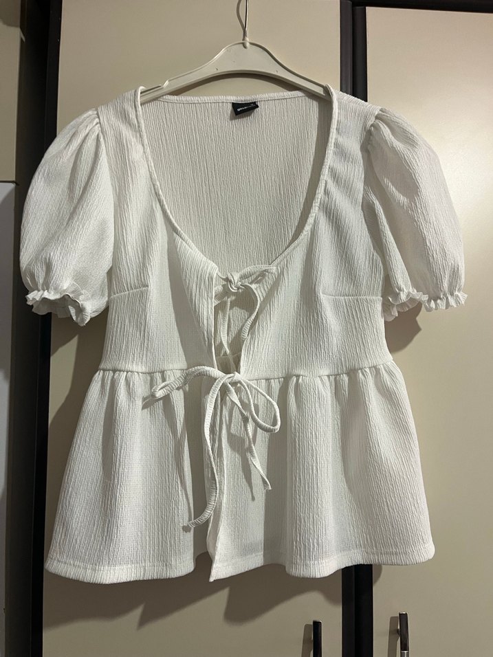 Düğmeli Beyaz Kısa Kollu Mini Keten Bluz