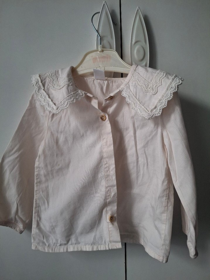 Bol kesim, keten kumaştan uzun kollu kız çocuk gömleği. Düğmeli ve pastel beyaz renkte, dantel yakalı detaylıdır.