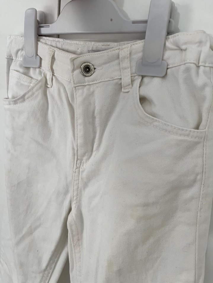 Pamuk kumaştan yapılmış, düğmeli ve beyaz renkli, sokak stiline uygun kız çocuk pantolonu.