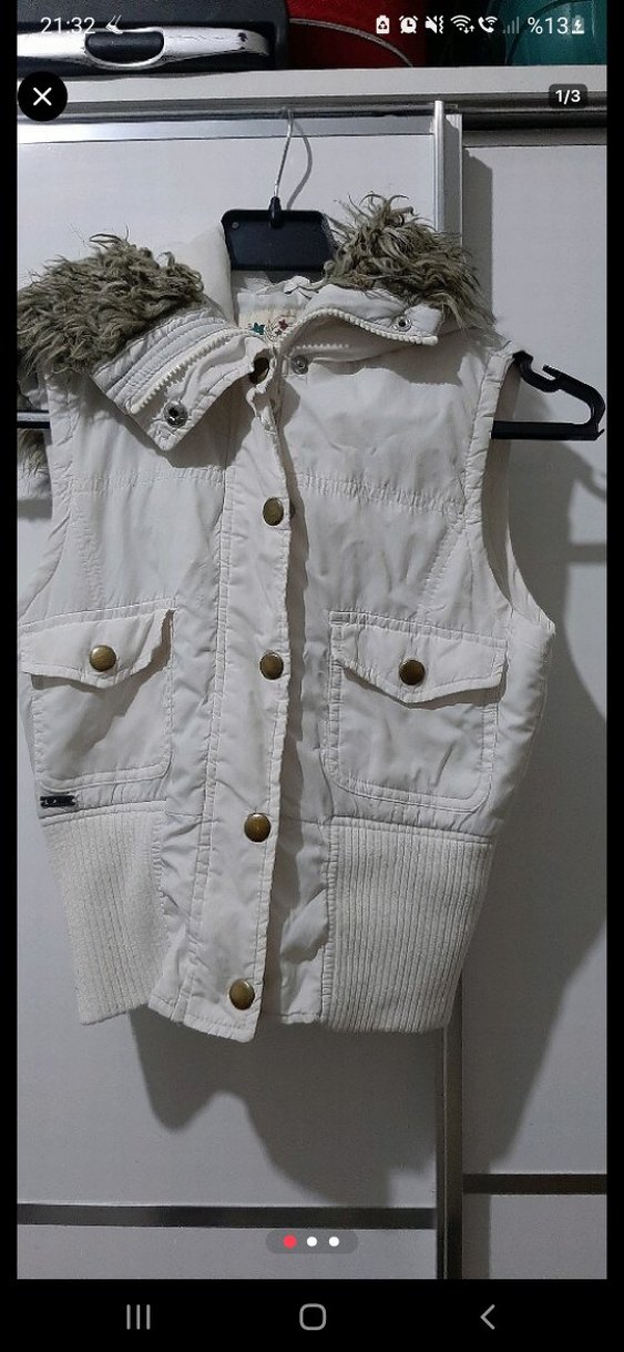 Pamuk kumaştan, düğmeli ve yakalı beyaz ki çocuk yelek. Cep detaylı, fitted kesim, ribanalı alt kısmı ile rahat kullanıma uygun. şapkası kürklü