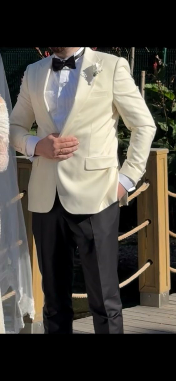 Klasik beyaz damat takımı, düğmeli ve yaka detaylıdır. Normal boy ve regular fit kesime sahip, düz ve desen içermeyen şık bir modeldir. 54 beden bir kere giyildi yüzde yüz yün