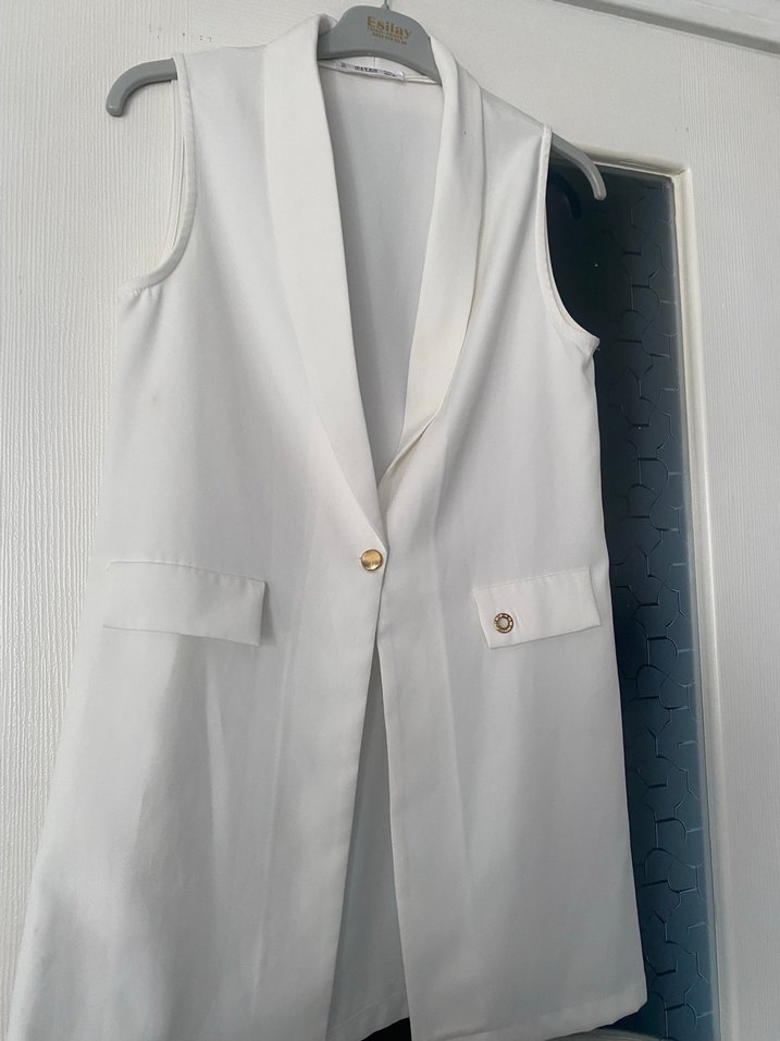 Düğmeli, kolsuz ve beyaz renkte olan bu kadın blazer, normal uzunlukta ve regular fit kesime sahiptir. Ofis ve günlük sokak stili için uygundur. Sentetik kumaştan üretilmiştir. ✨