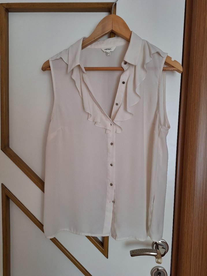 Kolsuz beyaz keten gömlek, yakalı ve düğmeli tasarıma sahiptir. Rahat kesimi ve midi boyu ile günlük kullanıma uygundur. 40-42 bedene uygundur
