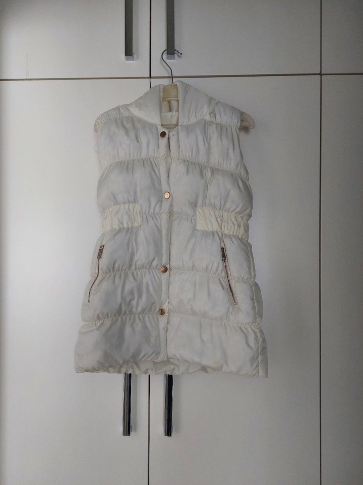 Düğmeli, yüksek yakalı, fermuarlı cepli beyaz kolsuz yelek. Rahat keten kumaştan, midi boy ve vücuda oturan kesim.40 cm bel boy 55 cm
