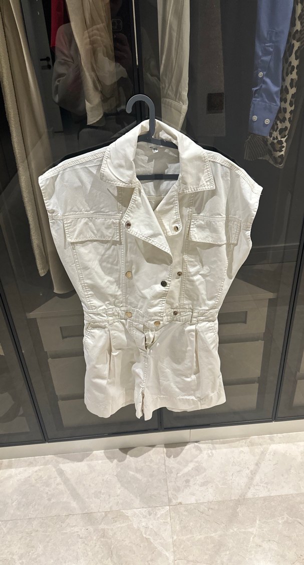 Beyaz kolsuz tulum, düğmeli ön ve kesik yakaya sahiptir. Keten kumaştan yapılmış, regular fit ve mini boydadır, günlük rahat stil için uygundur.