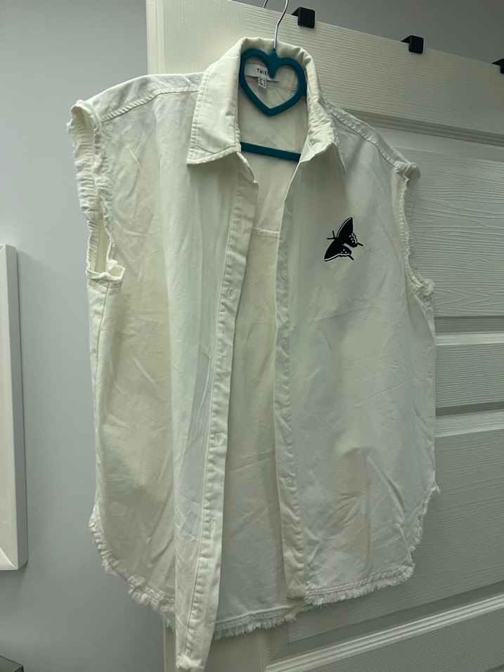 Beyaz, kolsuz pamuk gömlek, düğmeli ve yakalıdır. Rahat kesimi ve göğüs üzerindeki baskı detayıyla günlük rahat stil için uygundur.