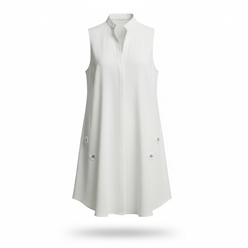 Yüksek yakalı, düğmeli kolsuz tunik. Rahat kesimli, midi boy, yumuşak keten kumaştan günlük kullanım için uygundur. Minimalist, sade ve desensiz beyaz renkli.
