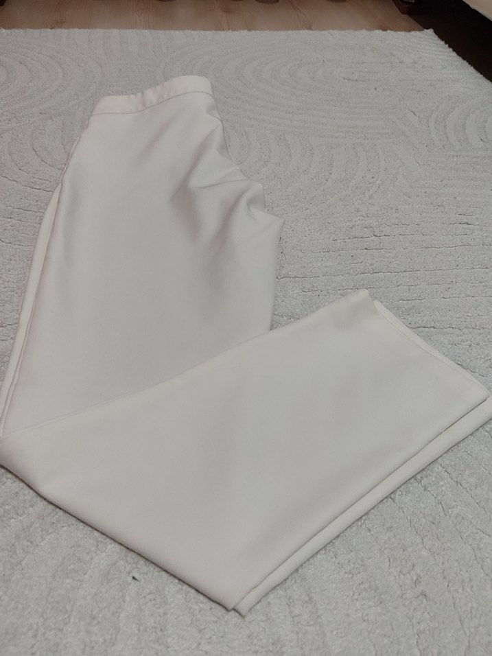 Düğmeli, beyaz kumaş pantolon. Ofis kullanımına uygun, düz ve sade tasarım. FINESUITS marka, 40 beden.Çok hafif tüylenme var,Beden genişletme yapıldı 42 bedene de olur,fermuar sağlam fakat bazen aşağı iniyor.