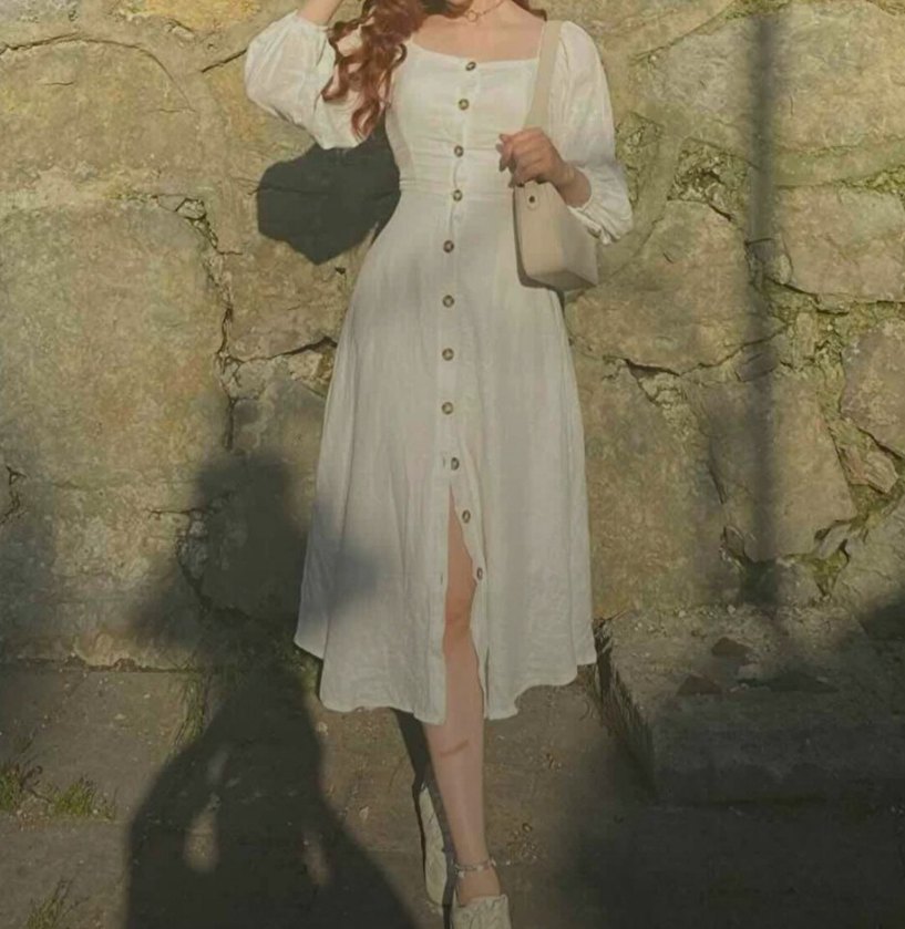 Düğmeli, askısız yaka ve uzun kollu beyaz keten midi pinterest elbise. Vintage bohem tarzıyla günlük kullanıma uygun.