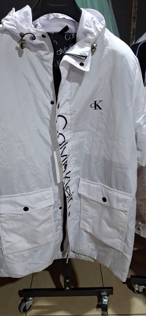 Düğmeli, yakalı ve uzun kollu beyaz erkek ceket. Bol kesim, parlak baskılı ve sentetik kumaştan yapılmıştır. Günlük kullanıma uygundur. Önde cepler ve 'cK' logosu bulunur.