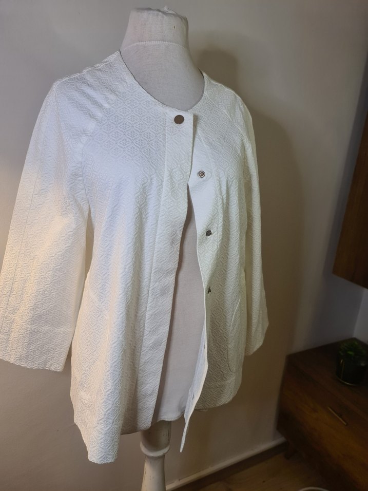 Beyaz renkli, düğmeli, keten kumaştan yapılmış, uzun kollu ve normal boyda hamile ceketi. Minimalist ve bohem tarzda, günlük kullanıma uygundur.