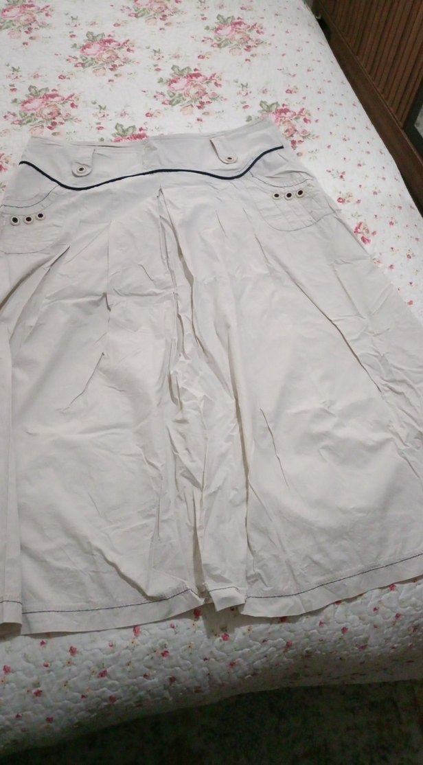 Pamuklu, düğmeli, beyaz midi hamile eteği, rahat ve günlük kullanıma uygun bol kesim tarzıyla.